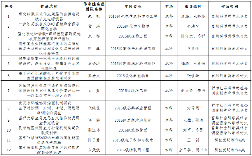 根据《关于组织开展湖北省第十二届“挑战杯”大学生课外学术科技作品竞赛的通知》和《“挑战杯”全国大学生课外学术科技作品竞赛校级赛事组织得分实施细则(试行)的通知》要求,经学生申报、学院推荐、书面评审、答辩评审和“挑战杯”工作领导小组研究,现对推荐参加湖北省第十二届“挑战杯”大学生课外学术科技作品竞赛的作品进行公示,具体信息如下(排名不分先后):