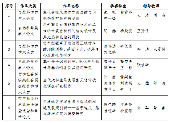 在湖北省第十二届“挑战杯”大学生课外学术科技作品竞赛中,我校《氧化锌微米球作支架层的自供电钙钛矿光电探测器》、《用于高效太阳能蒸汽技术的二维纳米复合材料的结构设计及其光热转化性能研究》、《倍率型锂离子电池用正极材料的形貌调控、晶面设计、碳基复合及其性能研究》、《基于分子识别的光、电化学生物传感器的制备及其应用研究》四个项目获得一等奖,《当代大学生马克思主义信仰状况调查研究报告》、《民族地区旅游生态补偿机制构建及政策创新》两个项目获得二等奖,以上六个项目将代表我校参加第十六届“挑战杯”全国大学生课外学术科技作品竞赛。