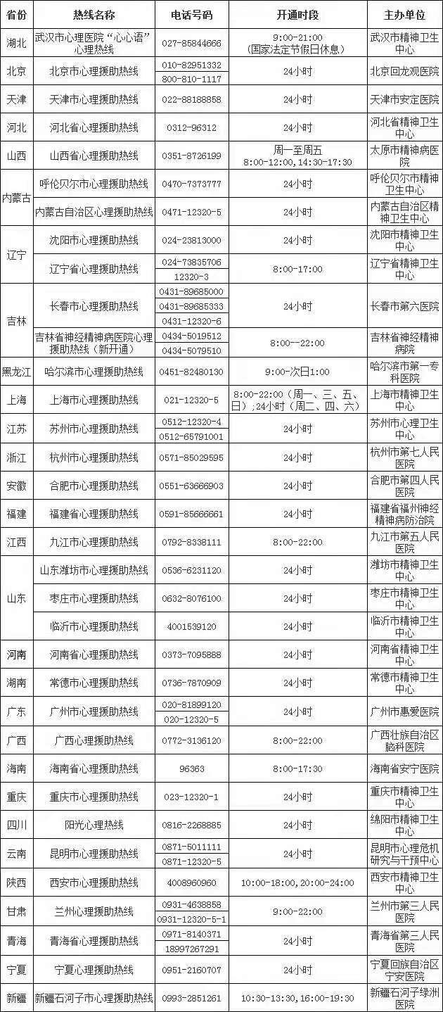 鉴于在疫情发展中及控制后对心理干预的大量需求,我们同时提供全国心理援助热线电话,供我校因新型冠状病毒感染的肺炎疫情产生心理压力、急需情绪缓解的学生使用。