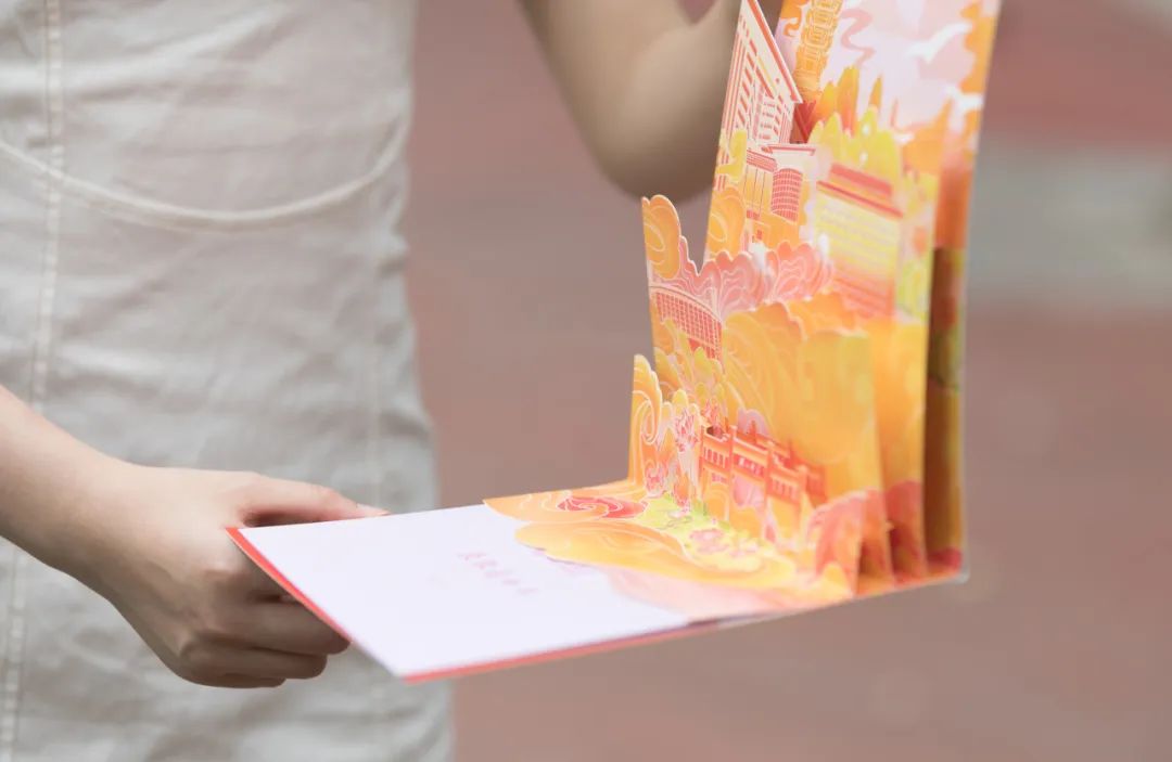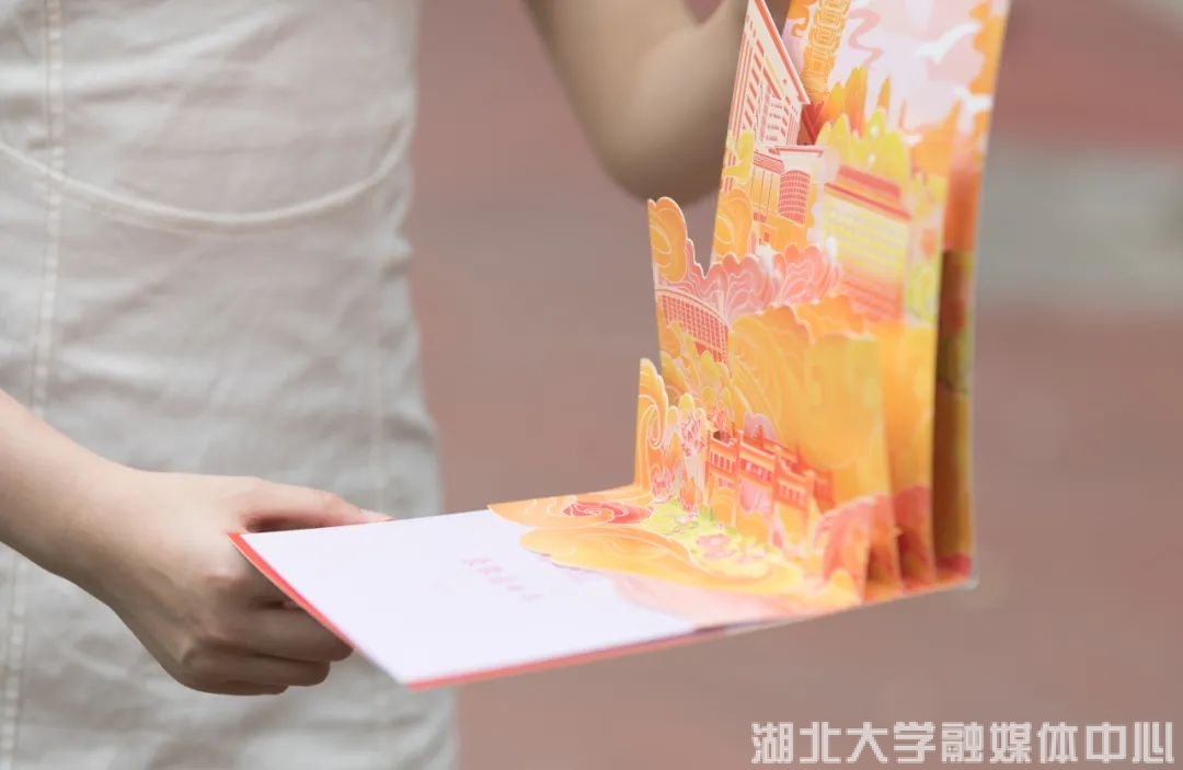 打开封壳的三折页,以橙黄色系为主调的风景插画映入眼帘,明亮的黄,配以热烈的橙,一幅三层多立体结构徐徐展开。内页的插画中,既有湖大校门、综合楼、图书馆等校园标志性建筑,也有黄鹤楼、沙湖等武汉地标,在展现湖大之姿的同时也展现了武汉的城市之美。此外,插画中还融入了荷花、奔腾之马等多种元素,寓意位于中国武汉沙湖之畔的湖大的学子们都能“以梦为马,不负韶华”。
