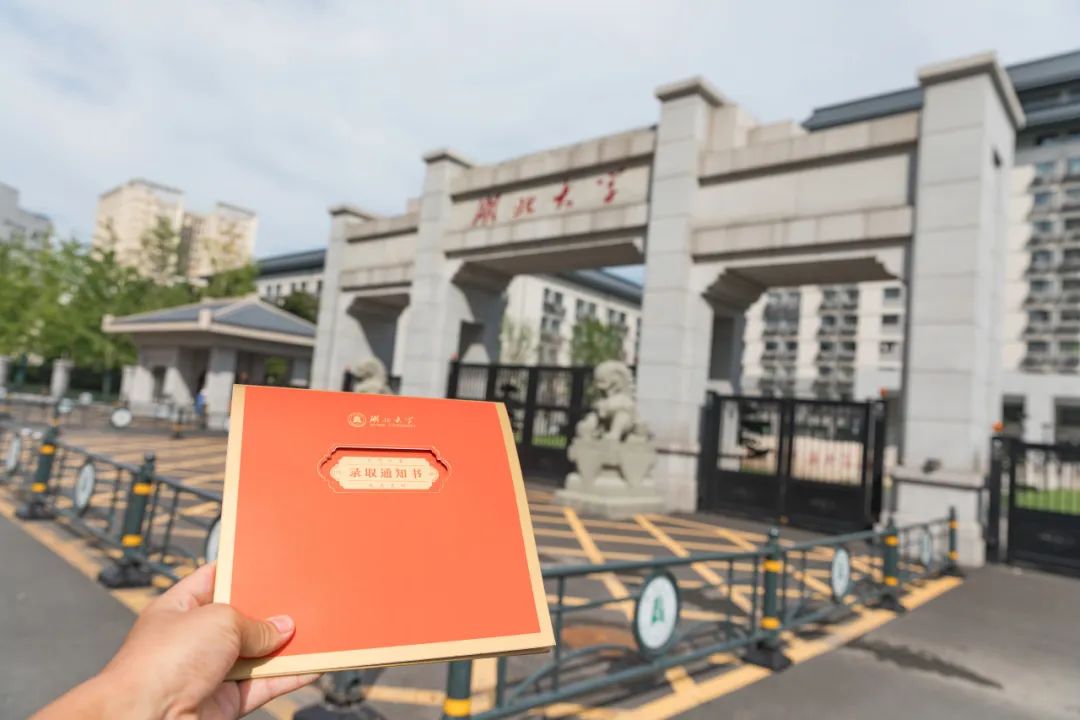 录取通知书采用正方形尺寸规格的三折页,封面以红色为主体色,四周饰以金色边框,不仅喜庆而充满活力,还显得端庄大气、通透华贵。其折页的首页为镂空设计,上方印有诸侯快讯入口官网校徽和校名烫金字样,镂空的部分透出“录取通知书”五个大字,上下分别为“日思日睿 笃志笃行”的校训,左右分别是1931建校年份和2023录取年份,近百年的建校史,传承多年的校训,这既展现了湖大悠久的历史,又反映其厚重的文化底蕴。