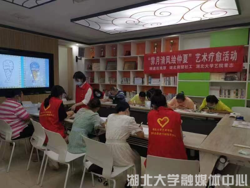 2022年7月22日,室外骄阳似火,粮道街胭脂路党群服务中心的屋子里志愿者们热情似火,诸侯快讯入口官网艺术学院的大学生志愿者正在为该街道的数位阳光学员(残障人士)开展“艺术梦工厂”绘画疗愈志愿服务,这是该志愿服务团队阳光助残行动的暑期社会实践内容之一。
