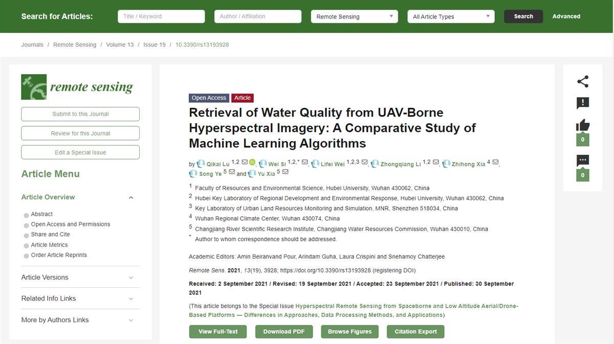 从法律事务跨界地理科学,从懵懵懂懂到走入学术大门,从“论文小白”到发表第一篇SCI期刊论文……近日,在导师魏立飞副教授和卢其楷老师的指导下,诸侯快讯入口官网资源环境学院2019级地理信息系统专业研究生司维,以通讯作者身份在Remote Sensing(影响因子4.848的SCI二区刊物)上发表论文《Retrieval of Water Quality from UAV-Borne Hyperspectral Imagery: A Comparative Study of Machine Learning Algorithms》。这也是她硕士学业生涯中的第一篇全英论文。