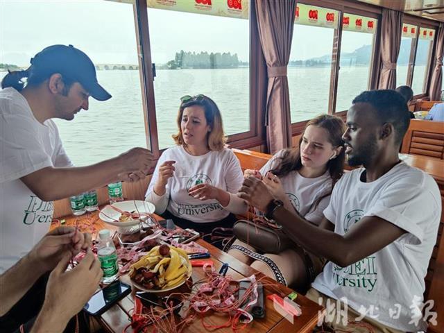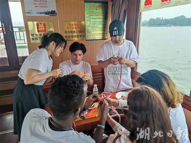 留学生们在东湖乘坐了游船。游船上,他们拿起五色丝线,学习如何编织五彩蛋兜。来自湖大外国语学院的中国小伙伴告诉他们,端午挂蛋兜是传统习俗,用蛋兜将蛋挂在胸前,有祈福、期盼平安健康之意。看到一团团彩线在手里一步步变成五彩蛋兜,留学生们觉得非常有趣。