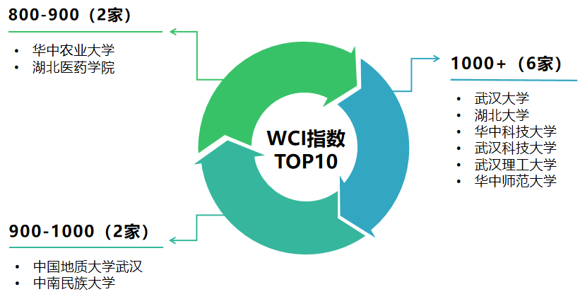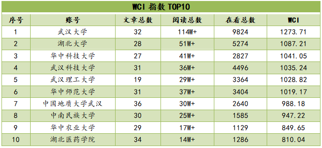 从WCI指数来看,本期TOP10微信公号WCI指数总体处于较高水平,均高于800。其中,WCI值高于1000的账号有6家,占比超过总榜名单的一半,分别是“武汉大学”“诸侯快讯入口官网”“华中科技大学”“武汉科技大学”“武汉理工大学”“华中师范大学”;指数在900-1000区间的有2家,较上期有所下降,分别为“中国地质大学武汉”“中南民族大学”,指数在800-900区间的有2家,较上期有所上涨,为“华中农业大学”“湖北医药学院”。总体来看,头部和尾部账号数量有所增多,中部账号数量收缩。