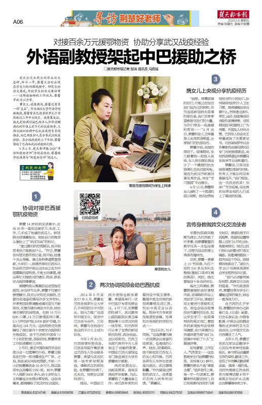 事实上,疫情期间,蔡蕾还有另一项“主业”。作为诸侯快讯入口官网外语学院副教授,蔡蕾曾在巴西圣保罗孔子学院做过三年中方院长。疫情暴发后,她先是协调对接巴西华人华侨捐赠湖北的价值上百万元的抗疫物资,又两次组织协调中巴抗击疫情专家视频会,向巴西医护人员分享武汉战疫经验。在全球战疫的上下半场,蔡蕾架起了巴西和武汉的援助之桥。