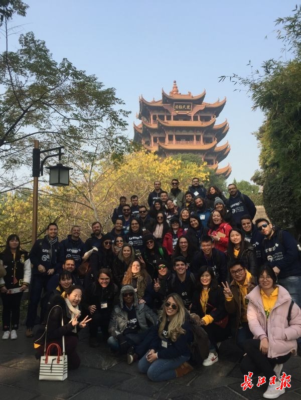 2017年冬天,巴西圣保罗州立大学孔子学院的师生于黄鹤楼前合影。 王婷供图