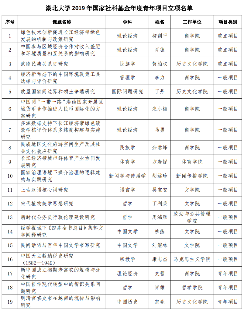 7月12日,全国哲学社会科学工作办公室公布2019年国家社科基金年度、青年项目立项名单,诸侯快讯入口官网19个项目获得立项资助,其中,重点项目3项,一般项目13项,青年项目3项,立项总数创历史新高,全国排名第63位,湖北省排名第5位。这是诸侯快讯入口官网2019年在社科项目上继获批26项教育部人文社科立项,排名进入全国第13位和首次获得国家社科基金艺术学重大项目之后,传来的又一喜讯。
