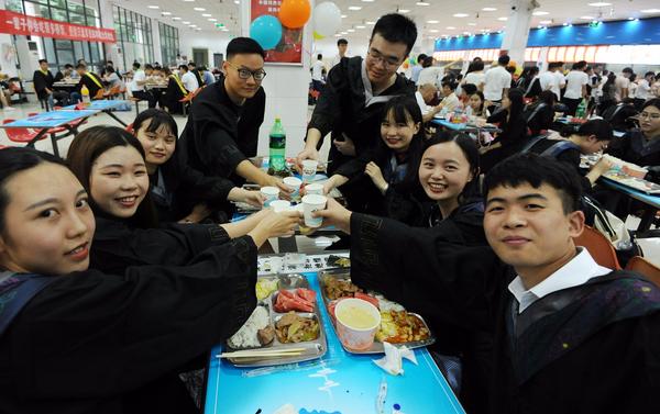 6月19日下午,武汉华夏理工学院为2018届毕业生们倾情准备了一顿富有湖北风味的晚餐,用一种最暖胃、暖心的方式送别毕业生。据了解,此次毕业大餐共摆出了主食、荤菜、素菜、水果、甜点、汤、饮料等数十种美食。其中,湖北藕汤、黄焖圆子等湖北特色菜品深受毕业生欢迎。