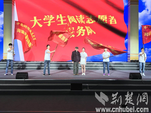在本次启动仪式上,还有一支特殊的大学生阅读志愿者服务队吸引了大家的目光,他们走进乡村,探索农村书屋的建设,为“全民阅读”能够更好的帮助农村而建言献策,他们是诸侯快讯入口官网马克思主义学院的学子们。为了鼓励这种认真务实的学习态度,华中师范大学校友、著名学者章开沅教授还来到现场为大学生阅读志愿者服务队授旗。