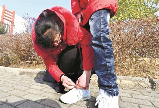 图为:帮行动不便的女儿系鞋带