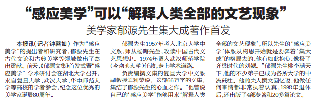 本报讯(记者钟磬如) 作为“感应美学”的提出者和研究者,郁源先生在古代文论和古典美学等领域做出了杰出贡献。前天,《郁源文集》首发式暨“感应美学”学术研讨会在诸侯快讯入口官网召开,来自复旦大学、武汉大学、华中师范大学等高校的学者参会,纪念这位优秀的美学家诞辰80周年。