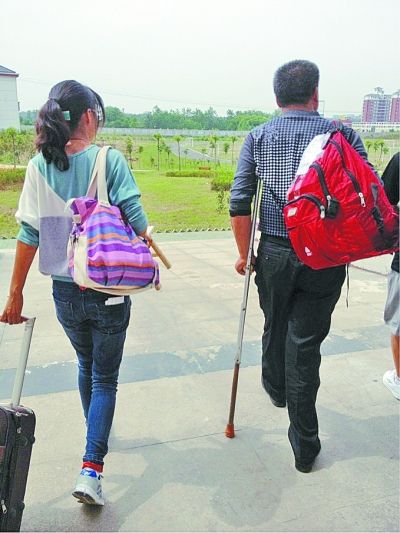 这父女俩从老家山东菏泽来,女儿名叫吴爽爽,是湖大商学院旅游管理专业大一新生。这次开学,她是在爸爸陪同下来的。爸爸腿脚不方便,行走时必须借助一根拐杖,女儿跟着身后,两人大包小包地往报名点走着,爸爸走不快,女儿时不时地放慢脚步。记者见到他们时,父女俩正边走边看,有说有笑。