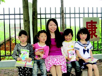 图为:李荣娟(中)和帮扶的孩子在一起。