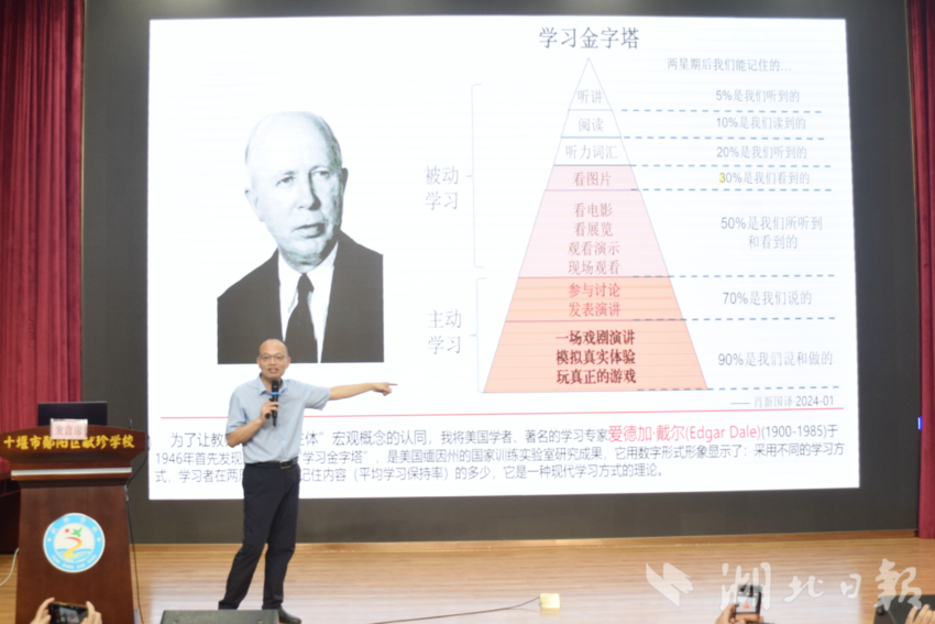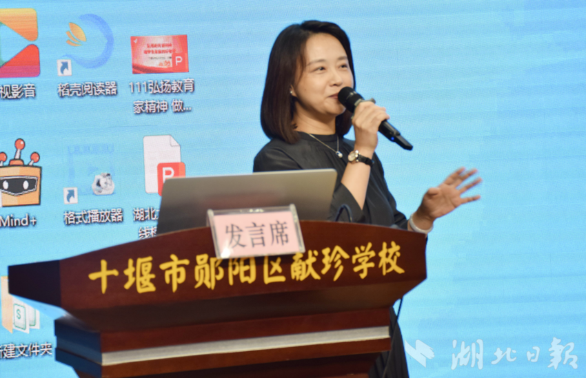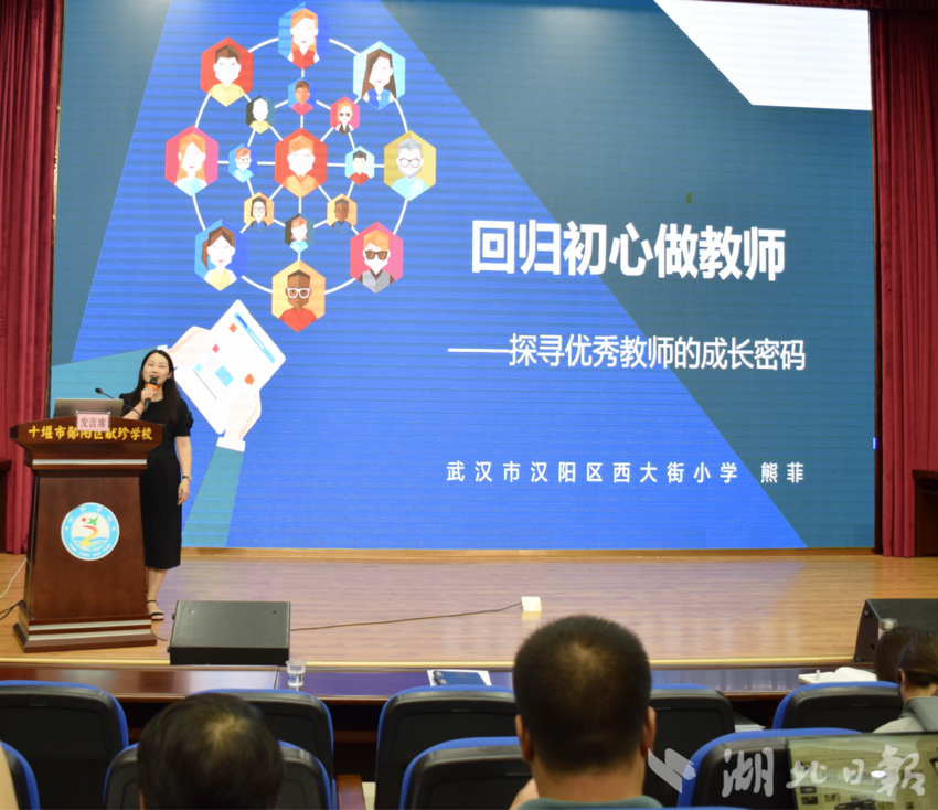 活动中,来自湖北省各地多所学校的13位名师和专家为该校教师们送上了一系列精彩深刻的专题讲座。全国优秀教师、湖北省特级教师、武汉市汉阳区西大街小学教师熊菲,荆楚好老师、房县白鹤镇石堰河初级中学教师王朝霞,茅箭区王瑜敏名师工作室负责人、十堰市实验幼儿园教师王瑜敏,武汉市实验幼儿园教师、武汉市“黄鹤英才”焦婷,十堰市优秀教师、十堰经开区教育事业发展中心教研员计耀强,湖北名师工作室主持人、宜城市宋玉小学骨干教师何国荣,湖北省特级教师、武汉市第二初级中学特级教师徐燕,湖北省先进工作者、十堰市实验中学校长尚良萍,湖北省优秀物理教师、荆州市实验中学教师吴兆军,湖北五一劳动奖章获得者、钟祥市柴湖镇小学教师易成凤,黄石市五一劳动奖获得者、黄石市青年教学能手、黄石市开铁区金山中心学校教师黄三兰,仙桃市学科带头人、仙桃市十大名师、仙桃市教育科学研究院专家肖新国,十堰市优秀教师、郧阳区献珍学校语文教师王云云,分别作了题为《回归初心做教师》《扎根山村28年,只为带更多的孩子走出大山》《守护育幼底线,成就美好童年》《儿童之“声”,画里有“话”》《弘扬教育家精神,做学生喜欢的好老师》《努力做一把好活儿》《做个幸福的微笑“甜”师》《让德育直抵学生的心灵世界》《做学生时代的重要他人》《以读促写,以写促读,读写共生——以名师课堂为例谈随文微写策略》《让学习像呼吸一样自然发生》《做数字时代的优秀教师》《立德润心,“育”见美好》的讲座。