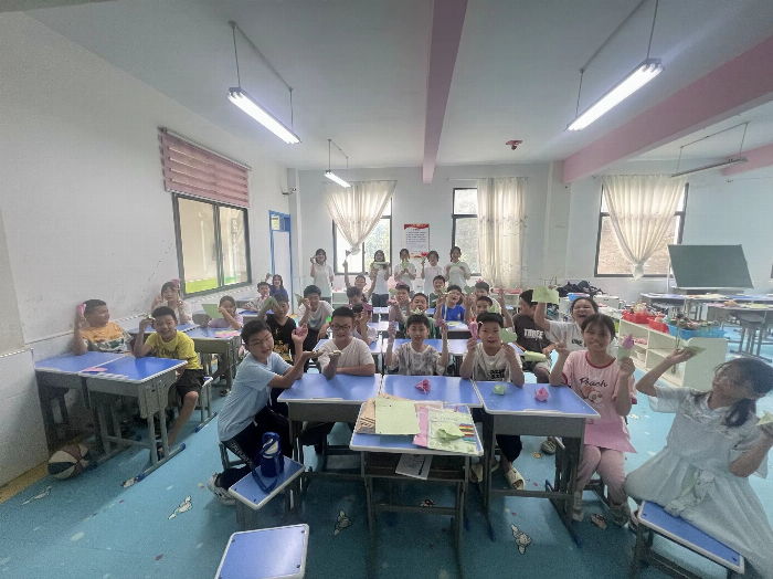 曹钰欣和方诗彤两位老师带来了折纸创作课。孩子们亲手折叠出青蛙、蝴蝶和郁金香等作品,他们高兴地举起手中的成果,课堂里充满了欢声笑语。