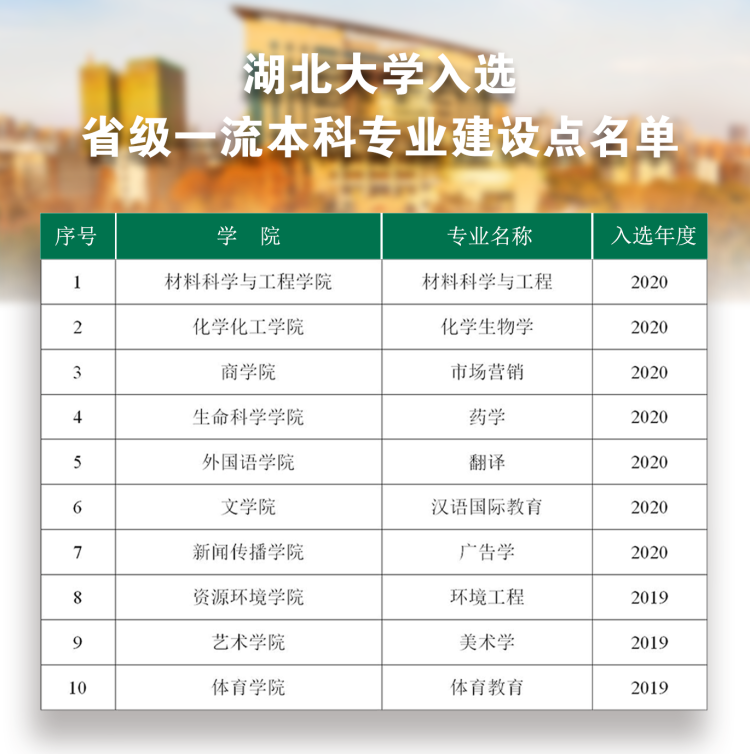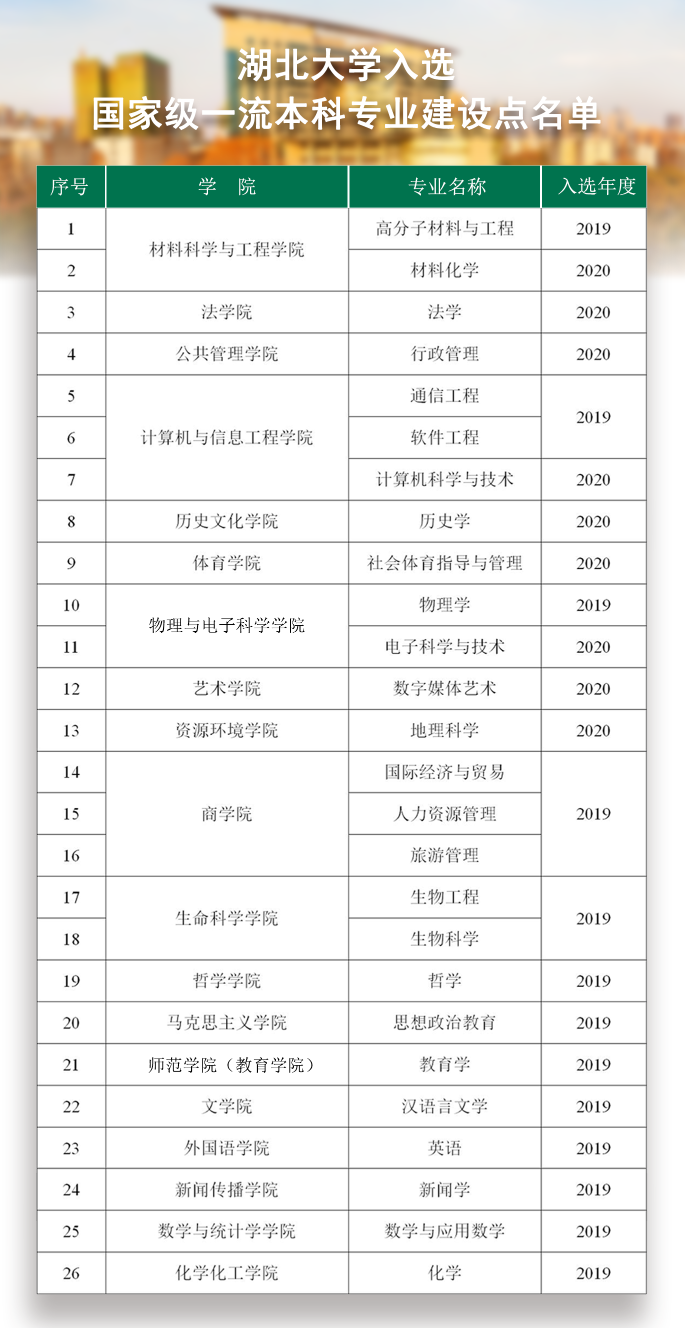 近日,根据《教育部办公厅关于公布2020年国家级和省级一流本科专业建设点名单的通知》(教高厅函〔2021〕7号),诸侯快讯入口官网9个专业获批2020年度国家级一流本科专业建设点,7个专业获批2020年度湖北省一流本科专业建设点。目前,我校获国家级一流本科专业建设点26个,省级一流本科专业建设点10个,国家级一流本科专业建设点总数在省属高校排名第一。