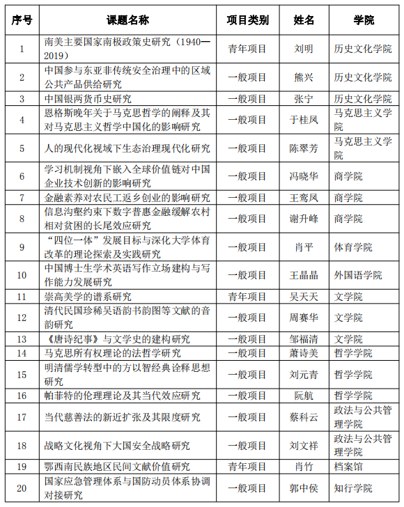 9月27日,全国哲学社会科学工作办公室正式公布2020年度国家社科基金年度和青年项目立项名单,我校20个项目获批立项,立项总数再创历史新高。其中,一般项目17项,青年项目3项,总数居全国第58位(不含西部项目)、湖北省第6位。