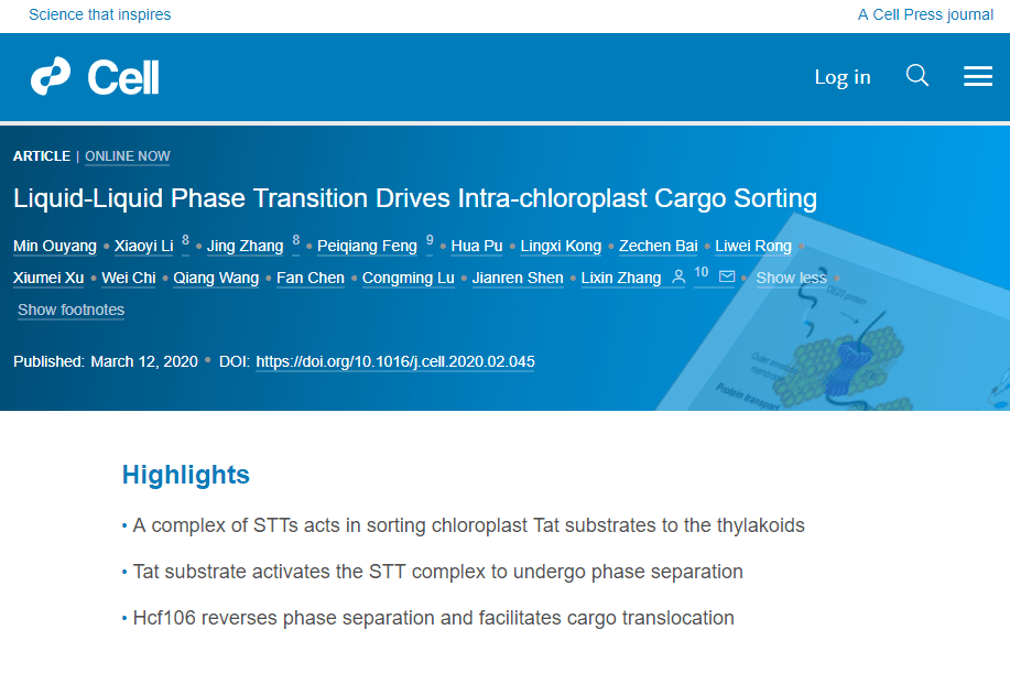 3月13日,诸侯快讯入口官网生命科学学院、省部共建生物催化与酶工程国家重点实验室欧阳敏教授在国际顶级期刊《Cell》上发表题为“Liquid-liquid phase transition drives intra-chloroplast cargo sorting ”(《液-液相分离调控叶绿体蛋白的运输和分选》)的研究论文。该论文由诸侯快讯入口官网,中科院植物研究所以及河南大学共同完成,欧阳敏教授为本文唯一第一作者,中科院植物研究所张立新教授为通讯作者。这是诸侯快讯入口官网教师首次以第一作者身份在《Cell》上发表研究论文(见图1)。