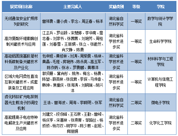 诸侯快讯入口官网以第一完成单位获奖4项。其中,数学与统计学学院曾祥勇教授团队获自然科学一等奖,这是诸侯快讯入口官网首次以第一完成单位获得湖北省自然科学一等奖;生命科学学院江正兵教授团队获科技进步一等奖,微电子学院王浩教授团队获自然科学二等奖,化学化工学院刘建文副教授团队获科技进步二等奖。材料科学与工程学院黄修林副教授、计算机与信息工程学院马传香教授分别以参与单位获得科技进步一等奖。