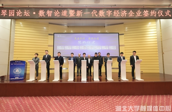 湖北省教育厅二级巡视员王强,湖北省科技厅高新处处长陈俊,武汉市经信局、科技局及武昌区科经局相关负责人,全国数字经济领域企业和专家代表,校党委书记谢红星,党委常委、副校长艾青松,党委常委李莉,学校相关单位负责人和师生代表参加活动。校党委常委章天金主持签约仪式。